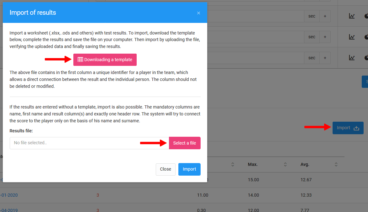 Das System ermöglicht es Ihnen, Testergebnisse aus einer zuvor vorbereiteten xls-Datei zu laden. Klicken Sie dazu im Fenster zur Eingabe der Testergebnisse auf das blaue "Import"-Symbol. Der Klick öffnet ein Fenster, in dem Sie die Dateivorlage herunterladen oder die bereits ausgefüllte xls-Datei laden können. Um sicherzustellen, dass die Daten gut gelesen und den jeweiligen Spielern zugeordnet werden, empfehlen wir die Verwendung einer xls-Vorlagendatei.