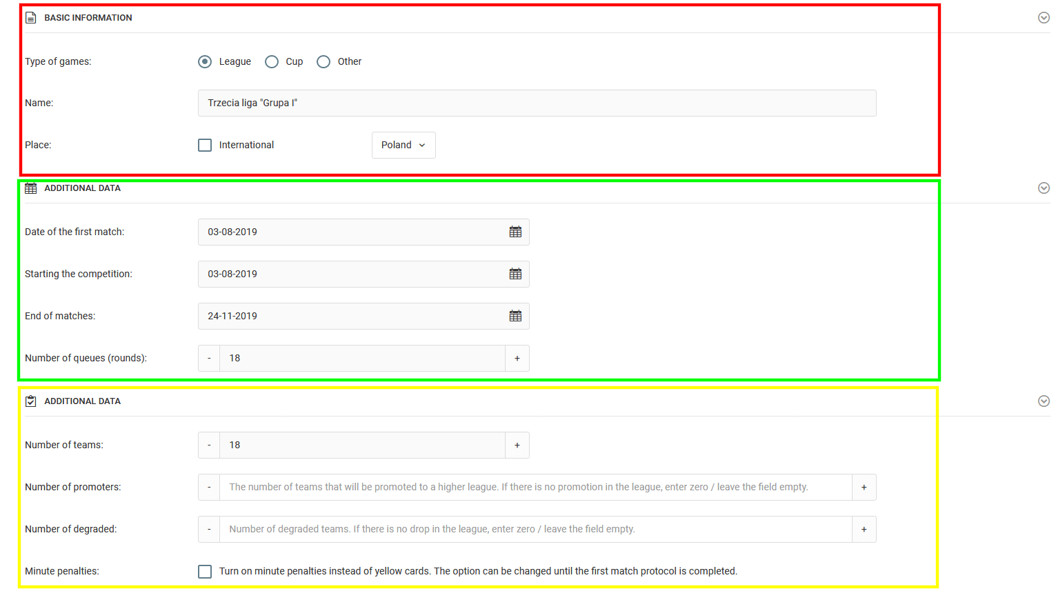 Sezona ir augstākā laika vienība sistēmā, un tai vienmēr vajadzētu ilgt divus kalendāros gadus, piemēram, no 2020. gada jūnija līdz 2021. gada jūlijam. Šis ievads tika apzināti veikts šeit, jo sistēmai ir jāatšķir spēles un sezonas. Sezonas ietvaros mēs varam izveidot jebkuru skaitu spēļu, kas var pārklāties. Katrai no tām var būt līgas tabula vai atsevišķs grafiks. Lai pievienotu jaunas spēles, noklikšķiniet uz cilnes sistēmas kreisās puses izvēlnē dienasgrāmata spēles pievienot jaunas spēles. Sistēma piedāvā divas iespējas pievienot spēles. Pirmā ir pieejama tikai komandām, kas piedalās oficiālajās PZPN (Polija) spēlēs, tā sastāv no gatavu spēļu grafiku lejupielādes izvēlētajai līgai no spēļu datubāzes, ko mēs atjauninām divas reizes gadā.