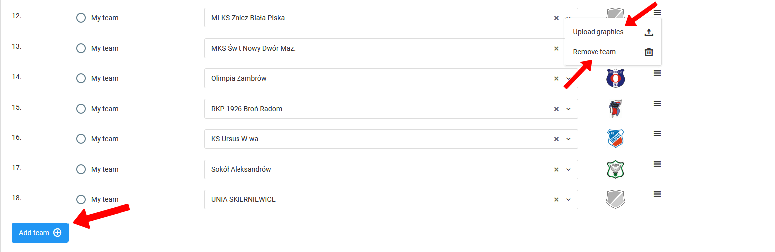 Pēc pamatdatu ievadīšanas par spēlēm ir laiks nākamajam solim. Aizpildiet spēlēs piedalošos komandu sarakstu. Papildus komandu nosaukumu ievadīšanai jūs varēsiet pievienot arī to ģerboņus. Šajā logā jūs arī varēsiet dzēst vai pievienot komandu dalībnieku sarakstam.