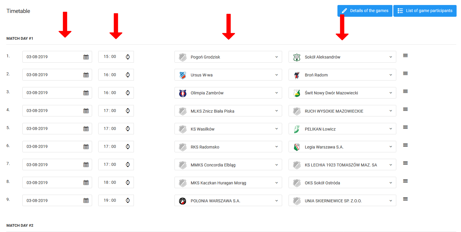 Spēļu izveides pēdējais posms ir spēļu pāru uzskaitījums katrā spēles kārtā. Jūs varat to izdarīt vienreiz, iet vai sadalīt posmos. Jums ir četri elementi, kas jāiestata: datums, laiks, mājinieku un viesu komanda katrai spēlei. Ir ērti sakārtot spēles dalībniekus, jo vienreiz izvēlēto komandu nevar izvēlēties atkārtoti vienas spēļu kārtas ietvaros. Šādi jūs izvairīsieties no kļūdas, plānojot spēles.