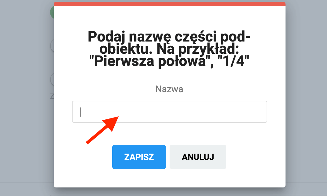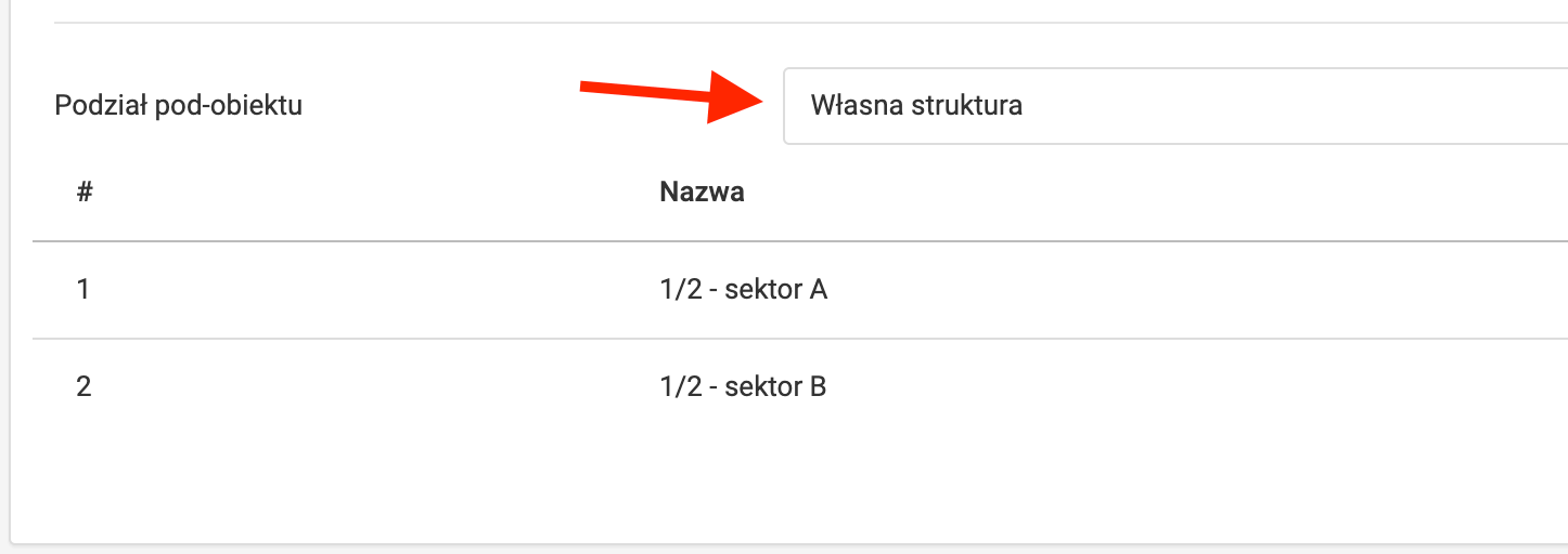 Aby podzielić pod-obiekt na strefy, kliknij w niebieski przycisk edytuj w panelu "podział pod-obiektu na części". Po kliknięciu zostaniesz przeniesiony do formularza tworzenia stref danego pod-obiektu. Aby dodać nową strefę, wybierz opcję własna struktura i następnie kliknij niebieski przycisk "dodaj część". Na ekranie pojawi się okno dodania nowej części/strefy wybranego pod-obiektu.
