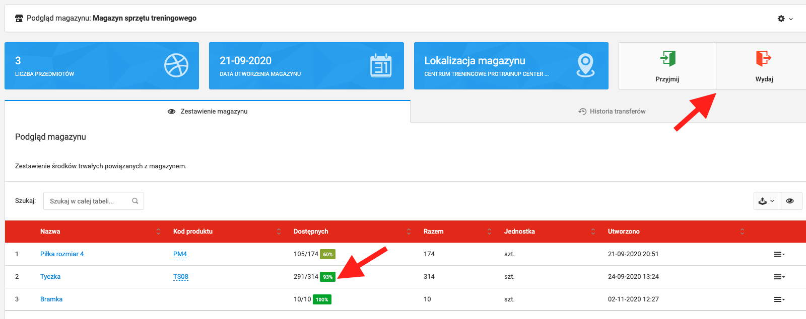 Aby wejść w podgląd magazynu, kliknij w jego nazwę na liście magazynów. Po otwarciu podglądu magazynu zobaczysz tabelkę, w której pojawiać się będą dodane do wybranego magazynu sprzęty. Na liście sprzętów poza nazwą znajdziesz także informacje o procentowym i liczbowym stanie magazynowym danego sprzętu.