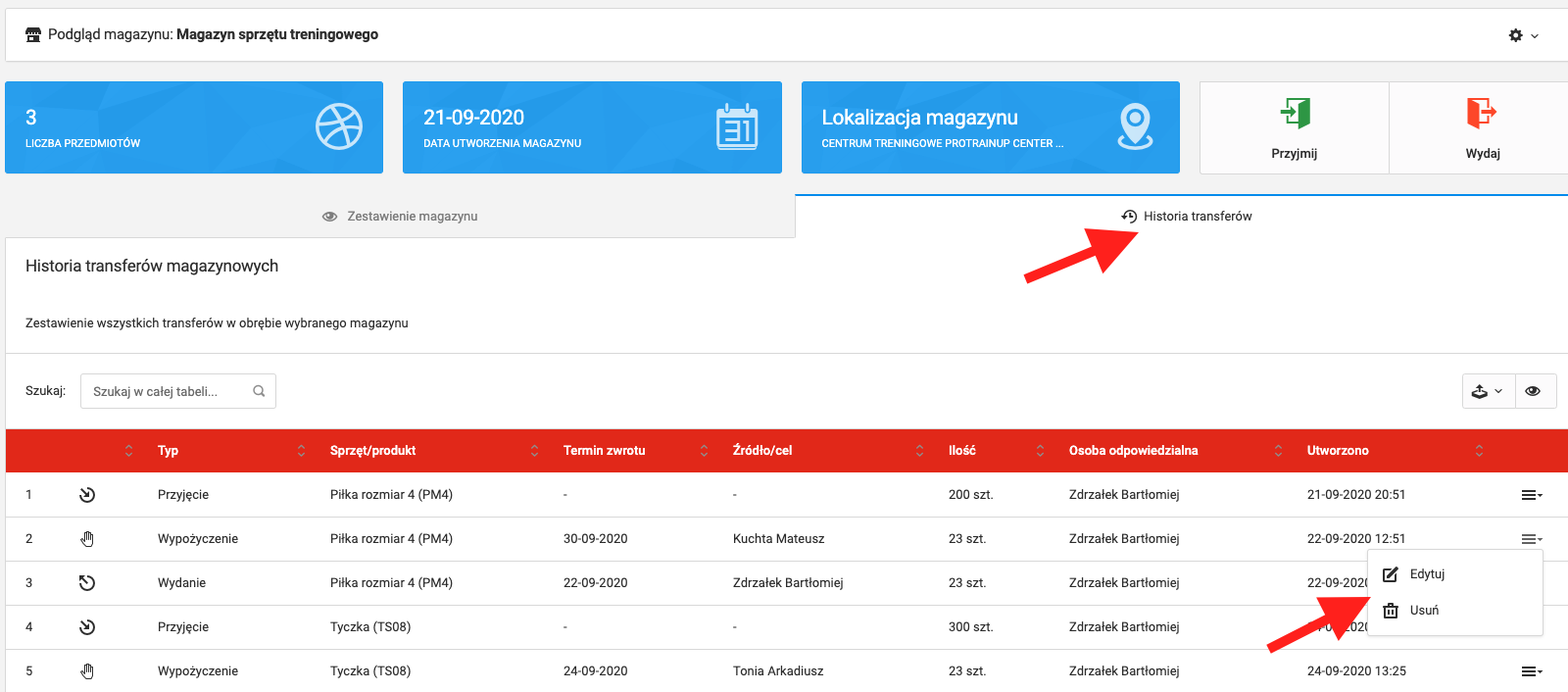 W tabeli historii transferów znajdziesz informację na temat każdego możliwego działania na sprzętach znajdujących się w wybranym magazynie. Każda operacja w magazynie może zostać usunięta lub edytowana. Aby to zrobić przy danej operacji w ostatnie kolumnie wejdź w menu i wybierz interesującą Cię opcję.